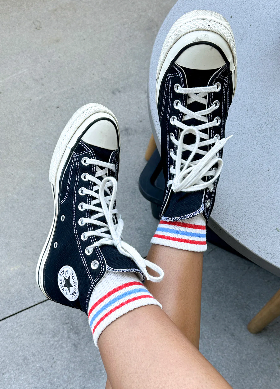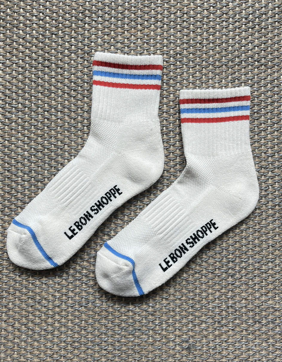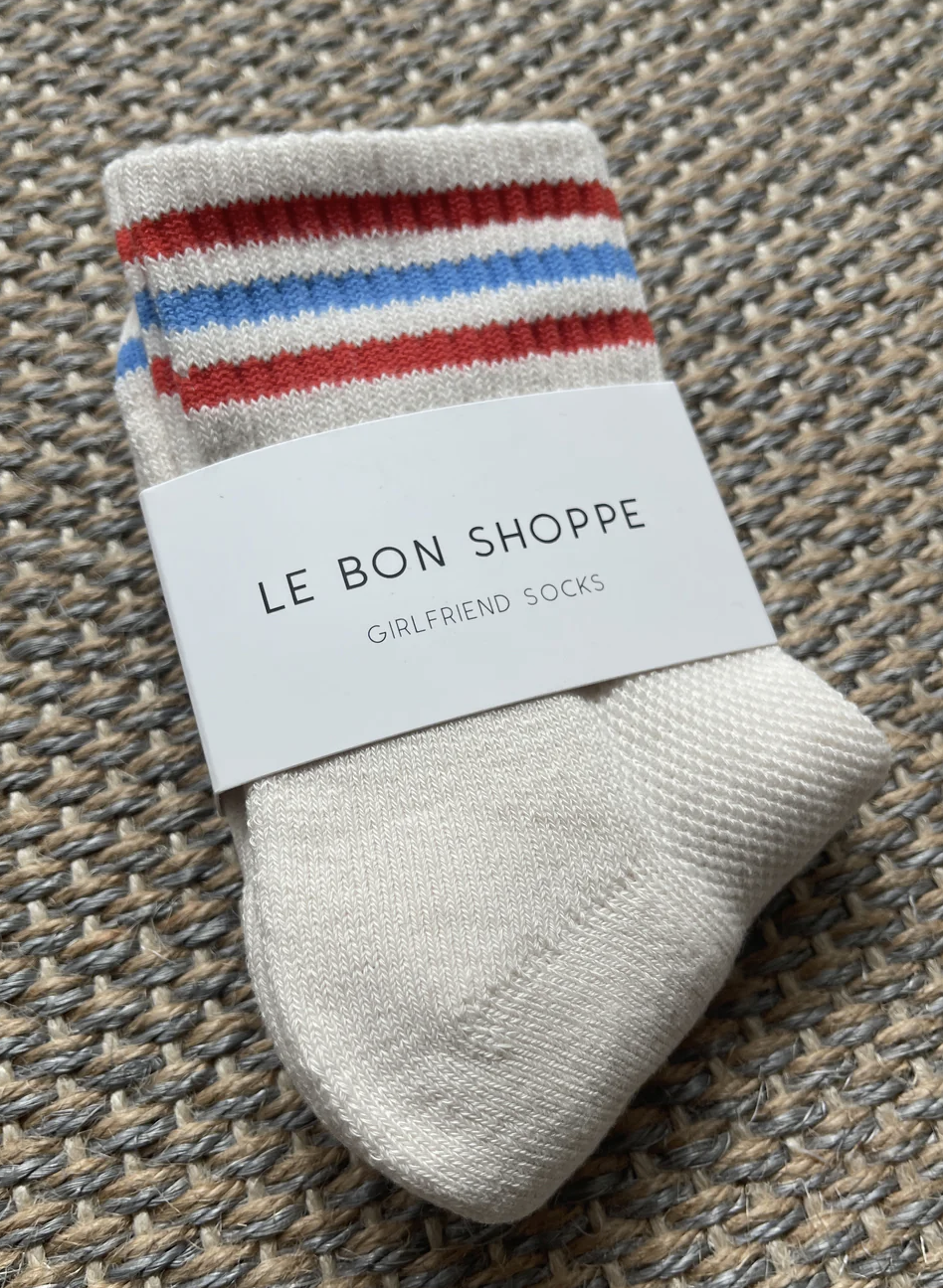 Le Bon Shoppe Girlfriend Socks are the cool crew version of the original bestseller and classic Boyfriend Socks. These beauties feature a tripe contrast stripe at the opening and a shorter classic crew sock length. She is a universally quintessential sock and especially flattering for our petite ladies.